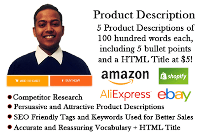 I will write SEO friendly and keyword rich product descriptions to ensure that you stay ahead of your competitors on search engines and e-commerce platforms. My style of writing (You can check my profile to see the tests I've taken on Fiverr) coupled with the use of pain points and trigger words will instill in the customer a real necessity for your products. I also offer a HTML code of the description to make sure it is presentable, readable and reassuring.